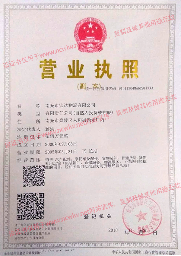 南充物流網(wǎng)(www.sdhuaduan.com) 南充市宏達物流有限公司營業(yè)執(zhí)照